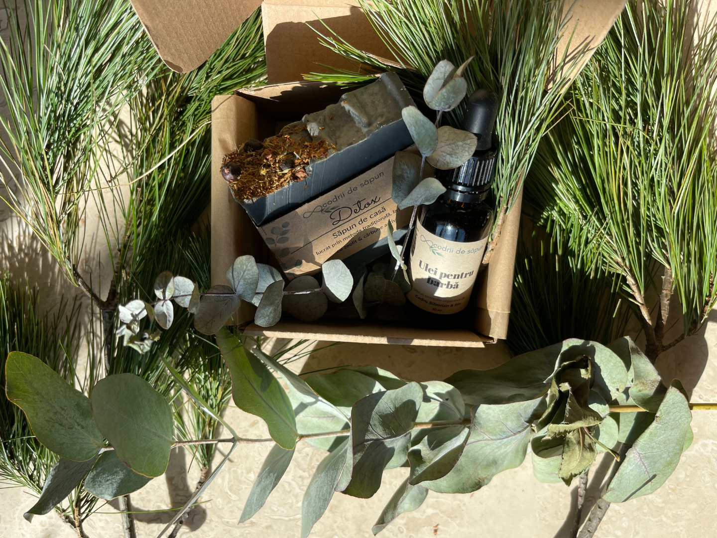 Produsele vin împachetate într-o cutie de cadou kraft, cu hârtie de mătase și o etichetă decorativă la exterior..