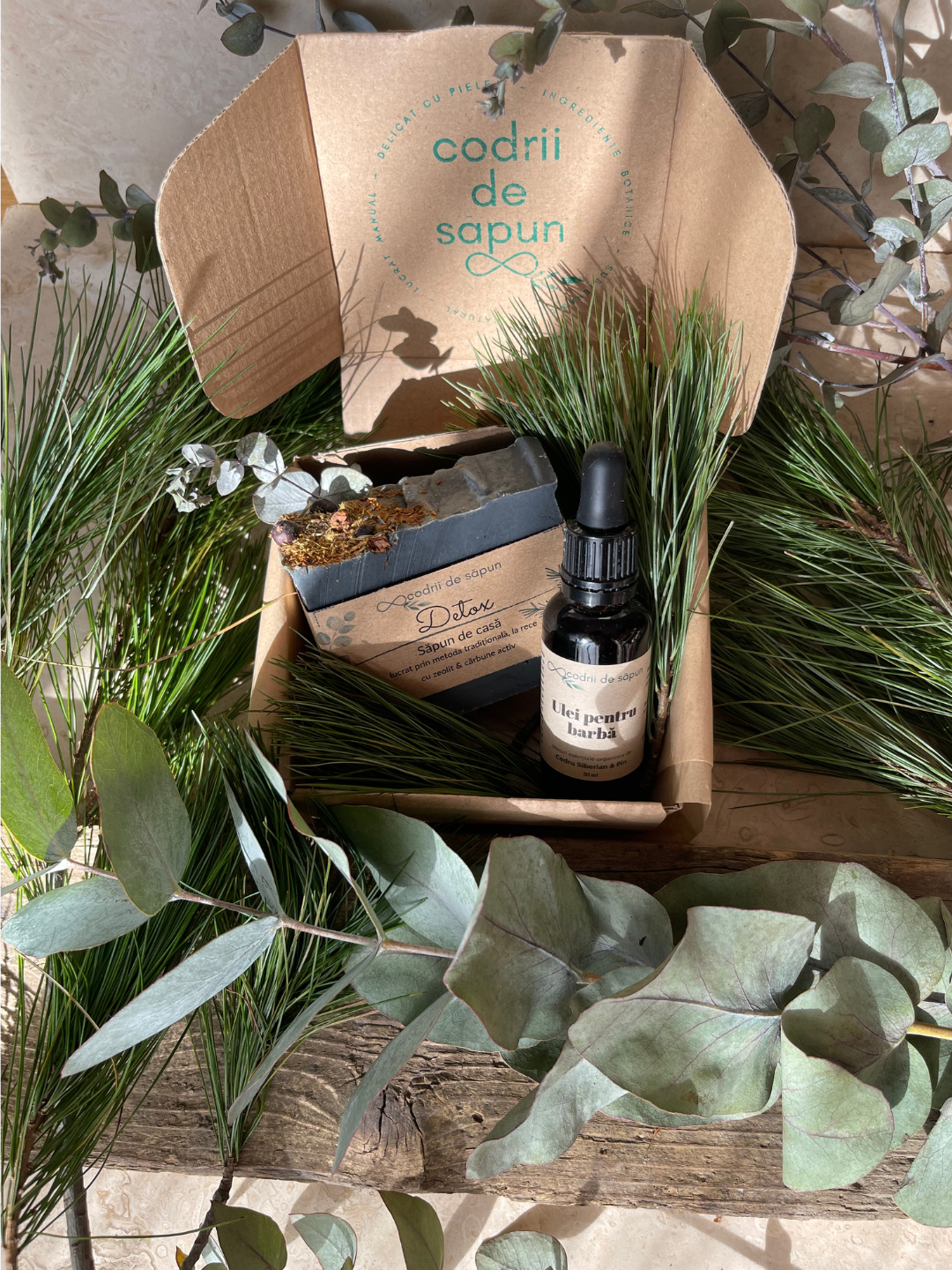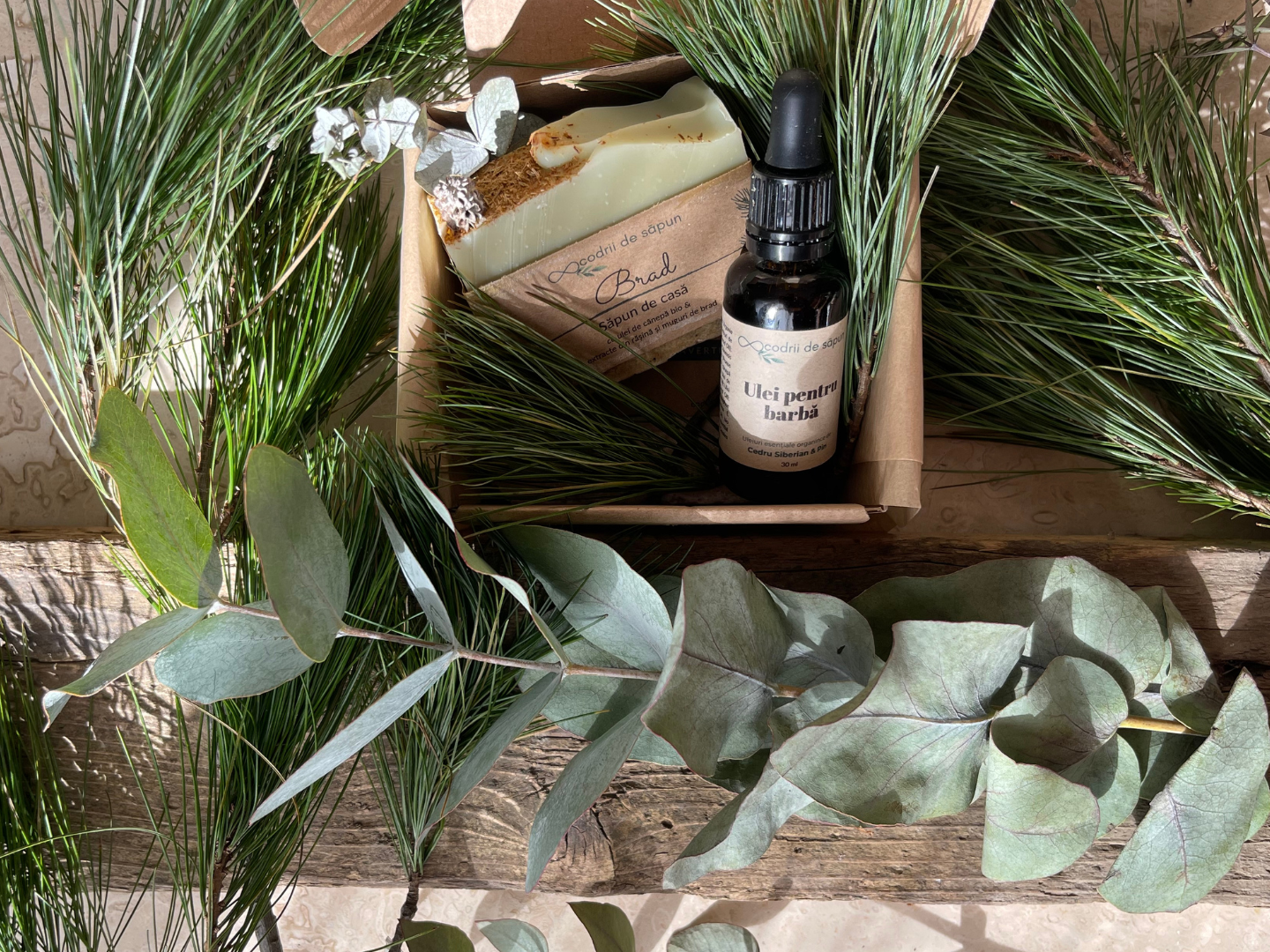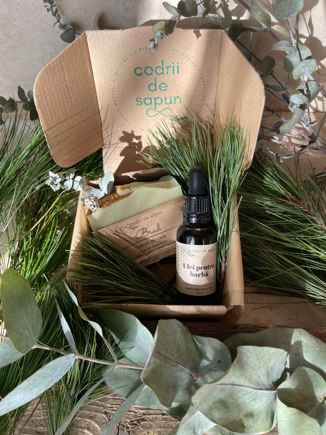 Pachetul conține un Ulei pentru barbă (care poate fi folosit și ca un ulei after-shave) și un săpun, la alegere, dintre Săpunurile Brad și Detox.